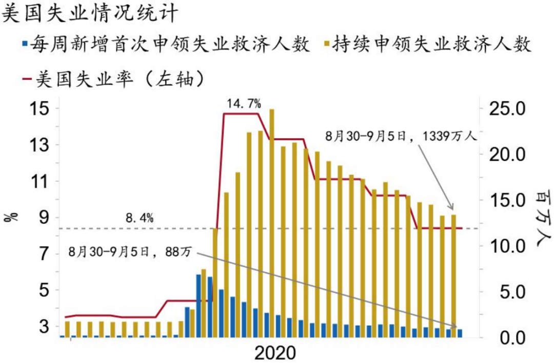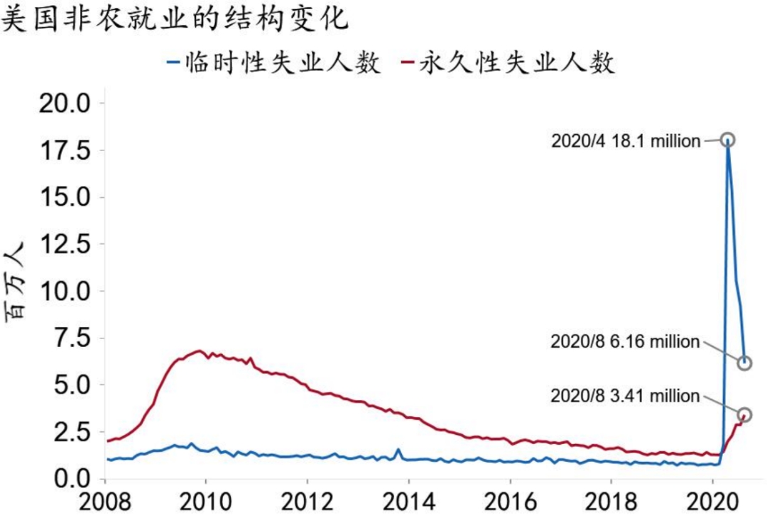 一是对美国就业市场的担忧。尽管经济重启后美国失业率迅速从14.7%的高点回落至8.4%,但需看到三个问题:第一,仍有约1,100万美国居民因疫情失业;第二,恢复的就业绝大多数来自临时性失业的减少,也即因疫情停薪留职的员工重返原工作岗位;第三,部分行业和地区仍在失血:每周新增申领失业救济的人数仍是疫前水平的四倍以上,永久性失业人数不降反增。总体来说,疫情对就业市场但来的结构性伤害不应被复工返岗产生的修复数据所掩盖。