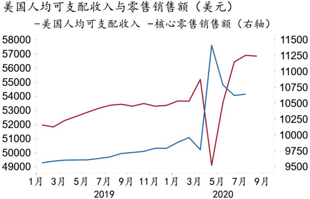 二是对美国进入长期低通胀的担忧。对“三低”(低增长低通胀低利率)的担忧是美联储在8月底对货币政策框架修改的主要原因。低通胀不仅不利于经济发展,也会压低利率,降低美联储的政策空间。联储主席鲍威尔认为过低通胀的风险不是“过时的学术理论”(idle academic theory),而已日益成为全球挑战:日本和欧洲已经在相当长的时间里无法走出低通胀泥潭。尽管经济重启后美国居民的消费支出在大规模财政刺激下迅速反弹,但在新一轮补贴缺位的情况下,8月的核心零售数据意外出现了疫后的首次环比负增长。