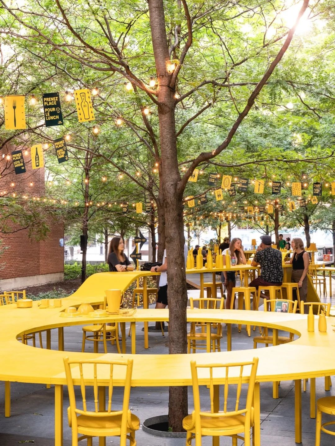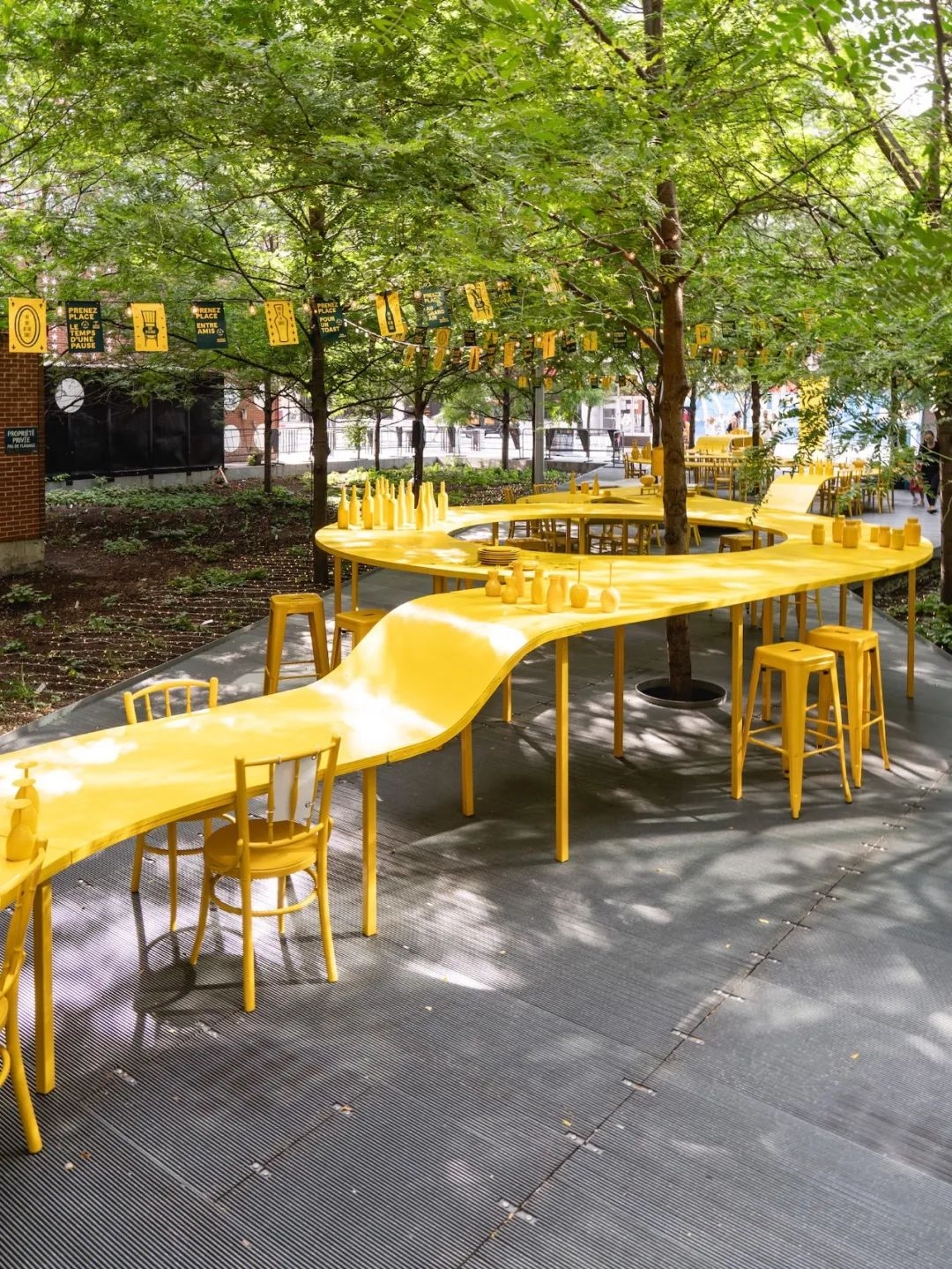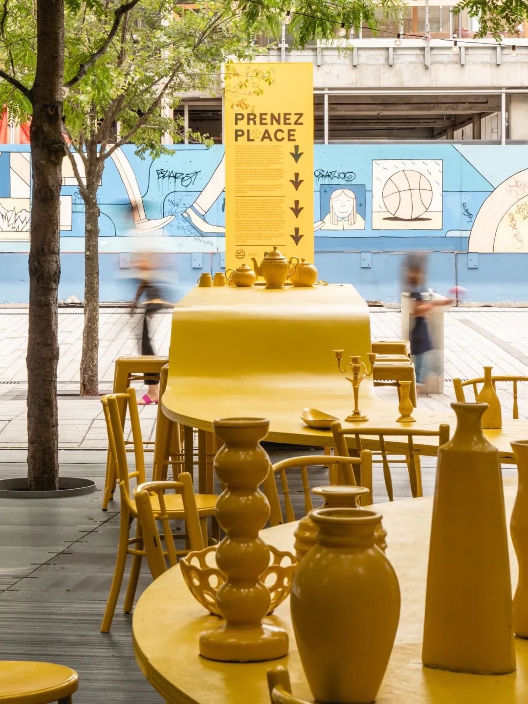 设计师最初的任务是制作一个可在保证社交距离的前提下,能吸引并刺激该区交通的艺术装置。在重新考察了因生态性荣获多项大奖的魁北克水利公园后,设计师将其3260平方米的场地改造成一个新的城市露天空间,并增加了相应的社交元素,即一个贯穿在现有家具和树木之间的长100米(300英尺)的“都市餐桌”。桌子在树下绵延起伏,为游客营造了各种舞台空间和社交氛围。