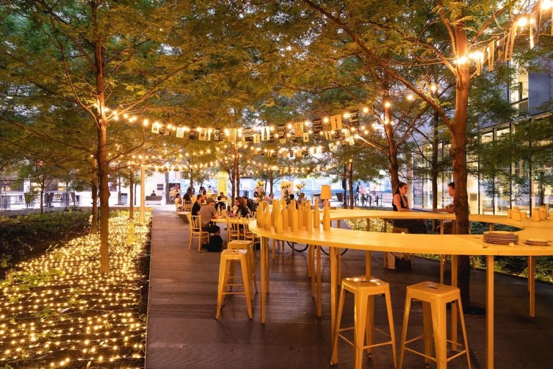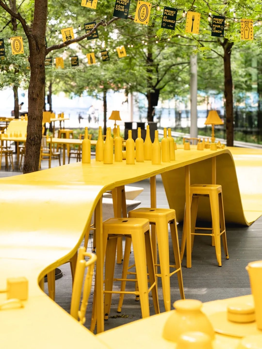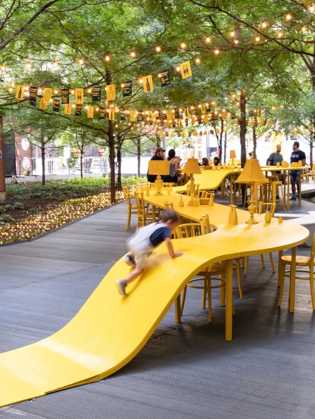 设计师最初的任务是制作一个可在保证社交距离的前提下,能吸引并刺激该区交通的艺术装置。在重新考察了因生态性荣获多项大奖的魁北克水利公园后,设计师将其3260平方米的场地改造成一个新的城市露天空间,并增加了相应的社交元素,即一个贯穿在现有家具和树木之间的长100米(300英尺)的“都市餐桌”。桌子在树下绵延起伏,为游客营造了各种舞台空间和社交氛围。