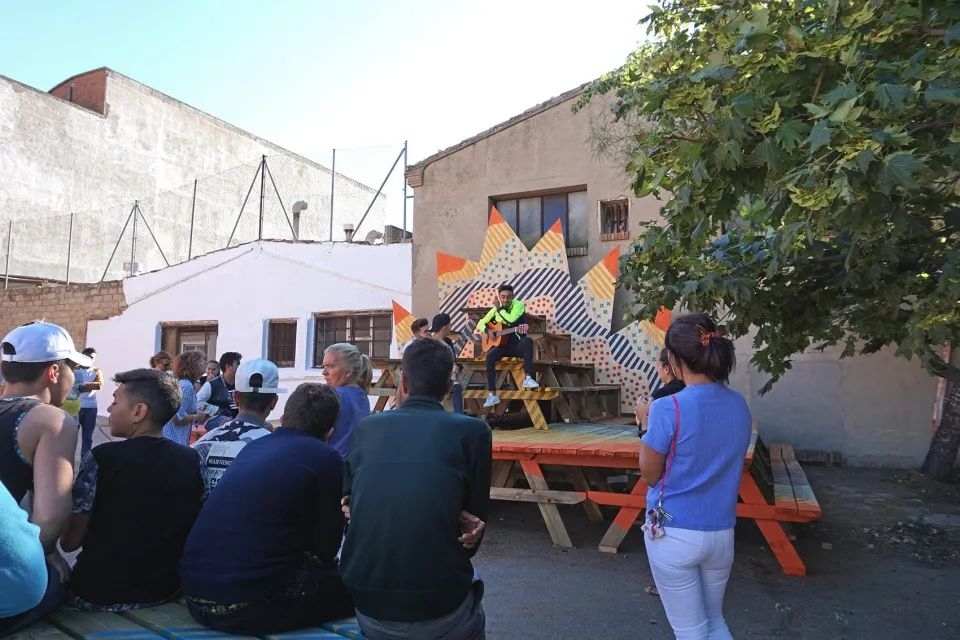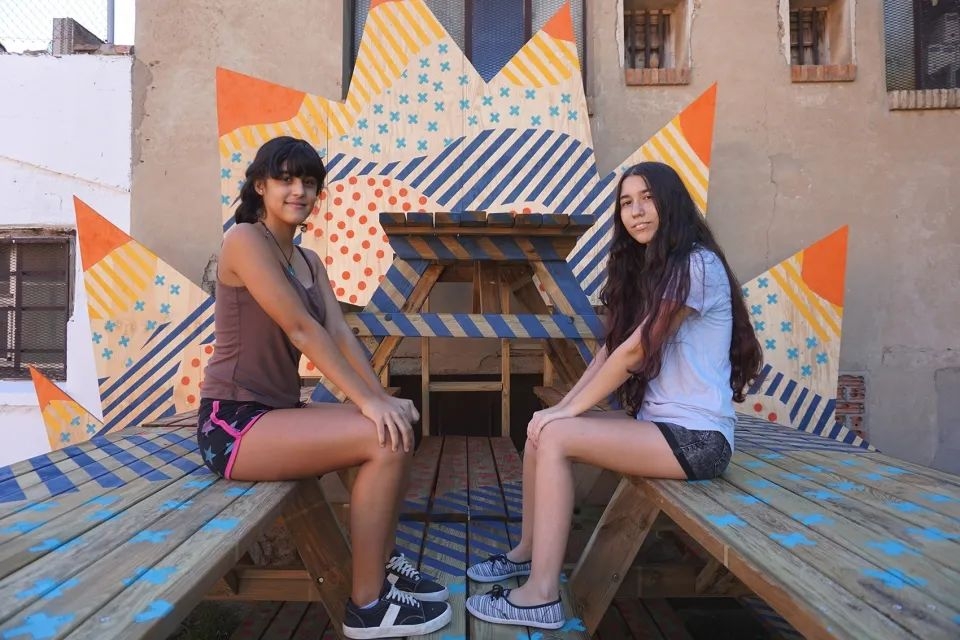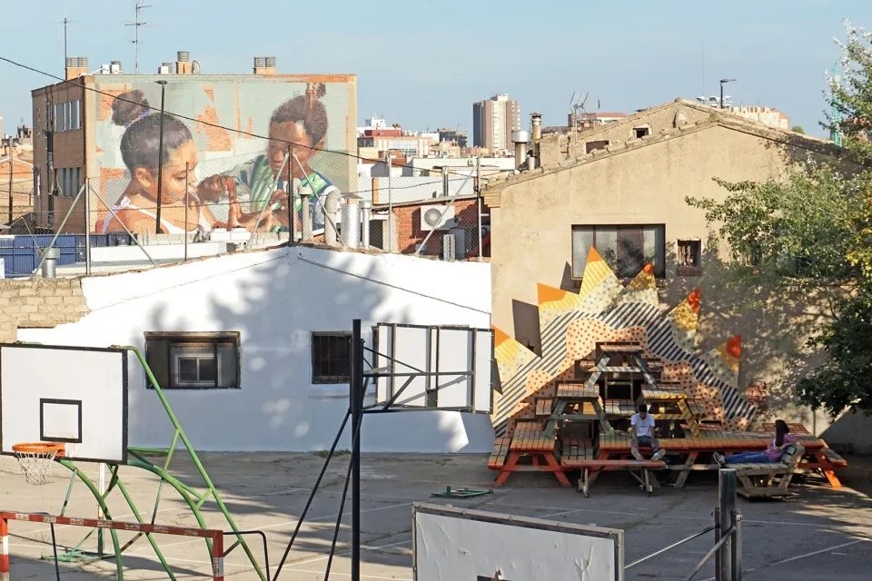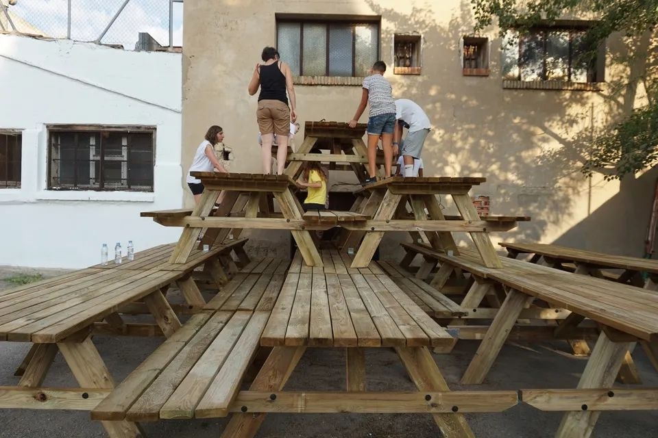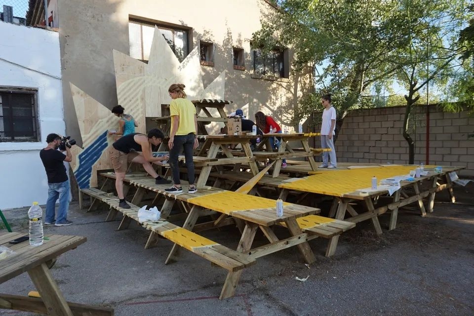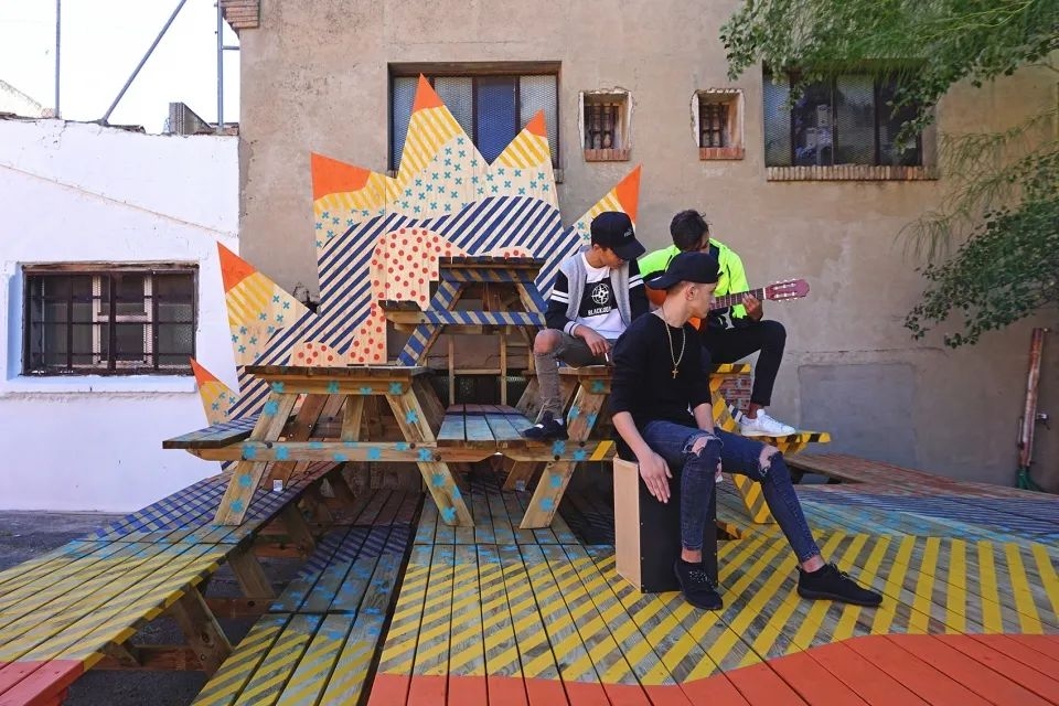 基于以上的想法,在萨拉戈萨举行的Asalto国际城市艺术节期间,工作室用17张野餐桌在IESMaríaMoliner学院的庭院里建造了一座“半金字塔”,学院的学生和教授以及那里的设计师和建筑师都参与到项目当中。在建造完成的前一天,设计师还为原型“金字塔”添上一幅幅别致的彩绘,使其看上去犹如一颗降落在校园公共空间的超新星。