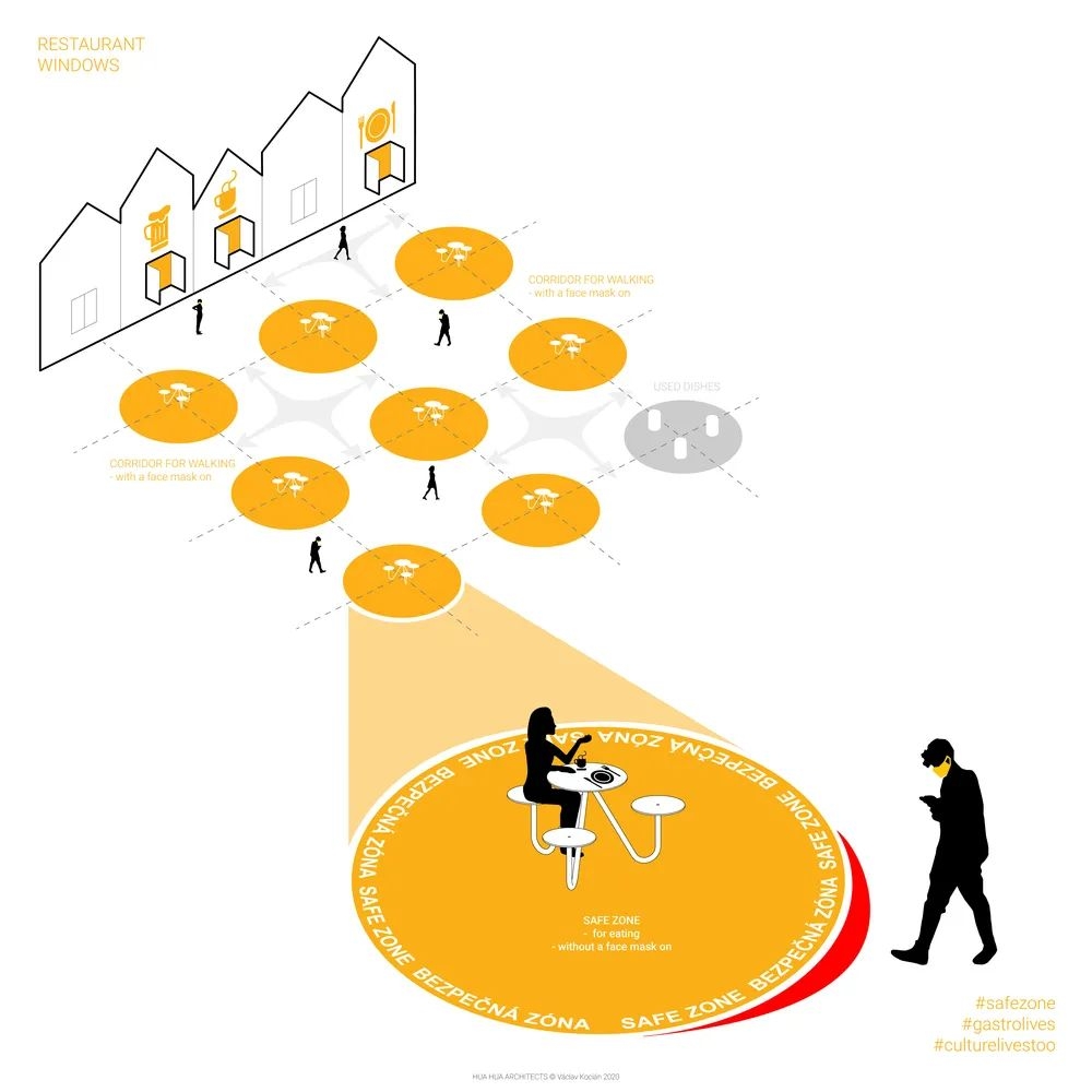 美食安全区也是一个长期项目。在疫情过后,这些餐桌可以用作公共家具,也可以在公园和游乐场中使用。通过在捷克共和国布尔诺的街道上安装第一个原型,该设计可在世界各地的城市广场中采用。
