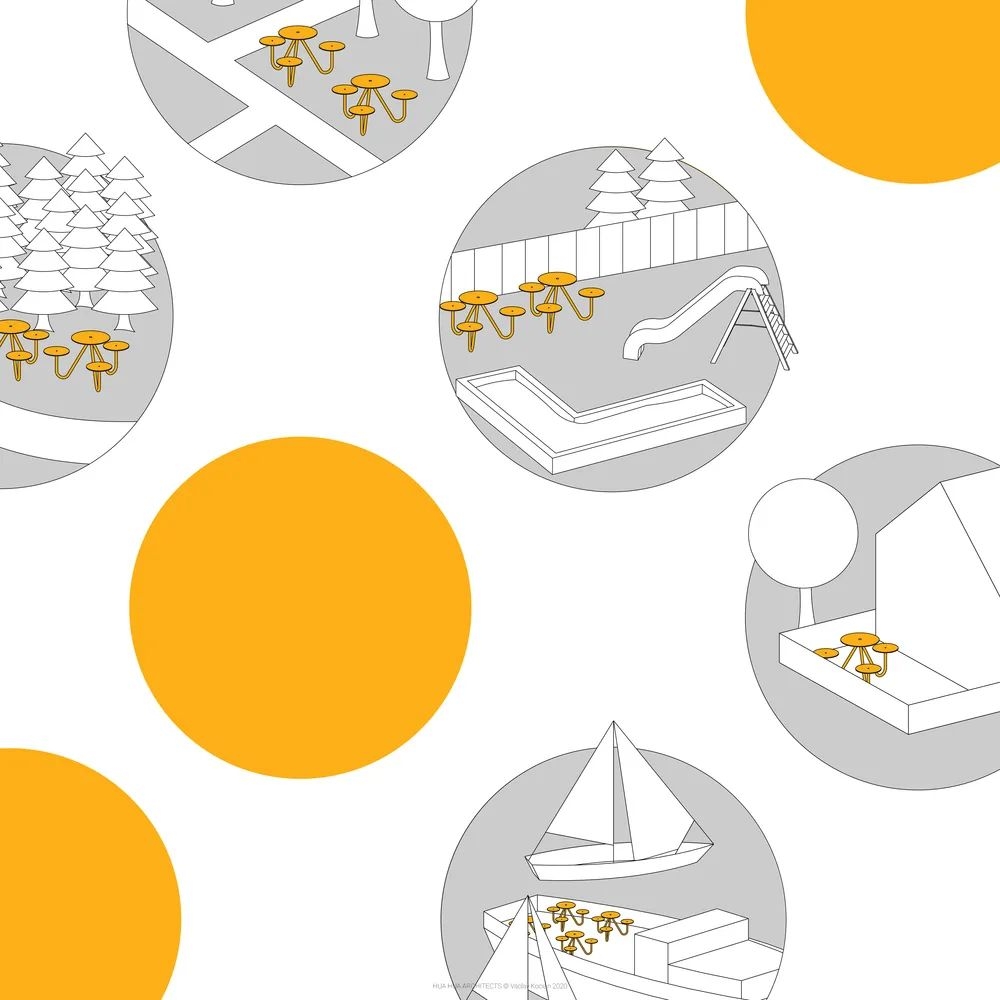 受生活圈,连贯性和无限性的启发,设计可以采用多种形状和形式。根据当局给出的标准,彼此隔开,每个安全区都配备了一个就餐区。饭桌在一个圆桌旁有3个座位,它是不可移动的,稳定并且具有抵抗力。在安全区内,人们无需戴上口罩即可进食。一旦离开网格,就需要戴口罩。