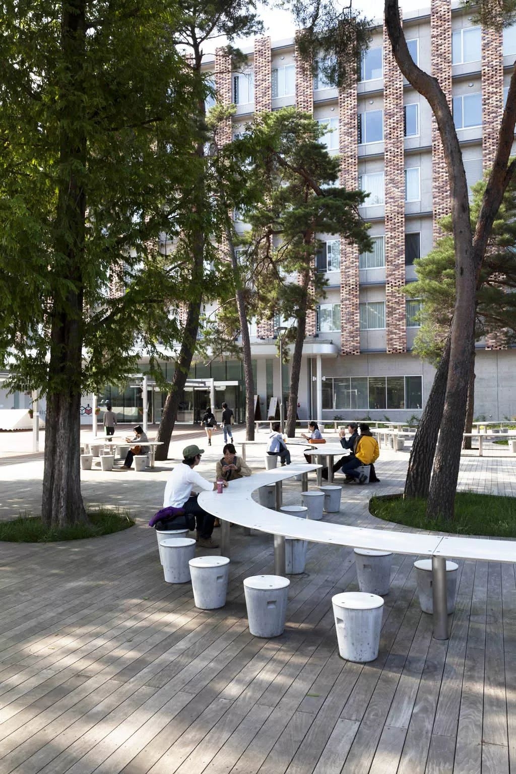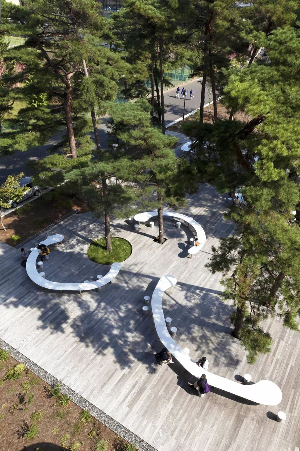 这是于2010年6月建成竣工的设计案例,由studio on site负责设计。在校园的这片林下空间,设置了很多曲线形的景观桌椅,简单的白色和形状让景观桌椅显得简约而纯粹。