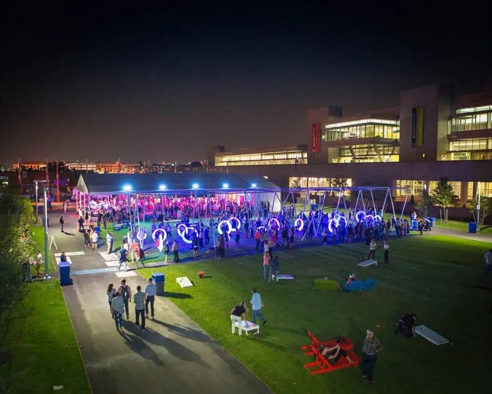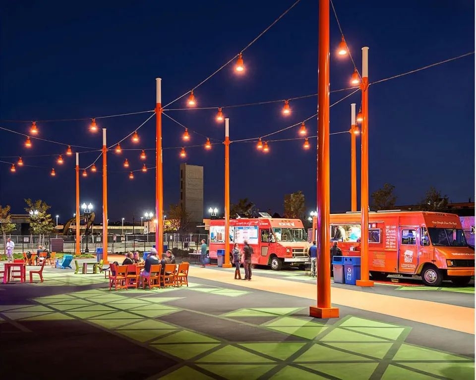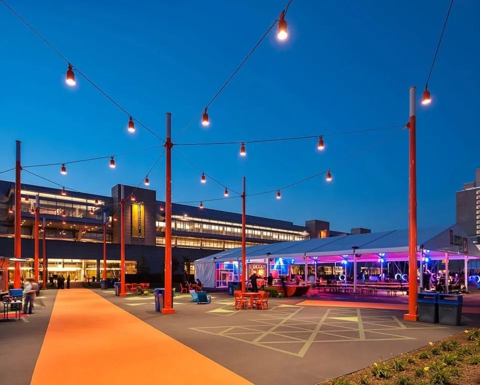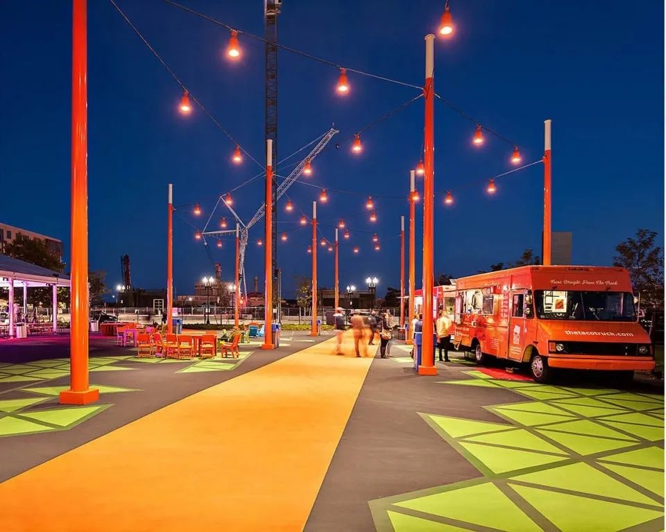 the Lawn on D 广场的主体空间分为硬质广场区与草坪区两个部分。在广场上,丰富的活动带来川流不息的人群。长长的橘色走道串联起街道与会展中心的侧入口,别具一格的照明系统划分出尺度适中的聚会场所,而色彩亮丽、趣味性十足的可移动家具仿佛在邀请着人们尽情发挥想象力,打造专属的小空间。