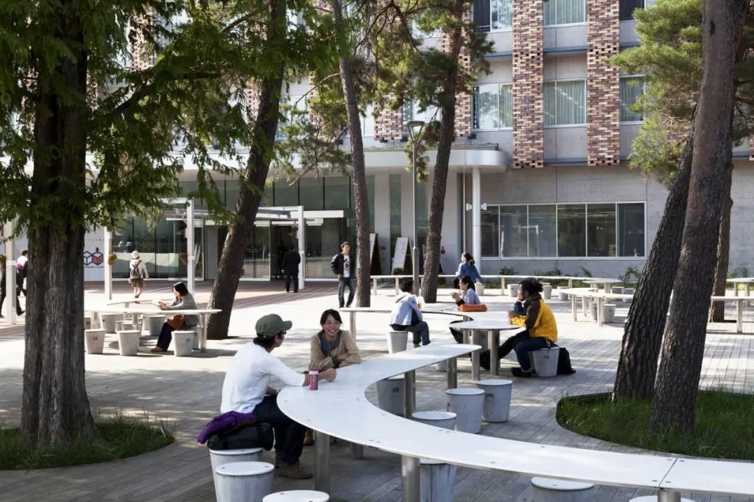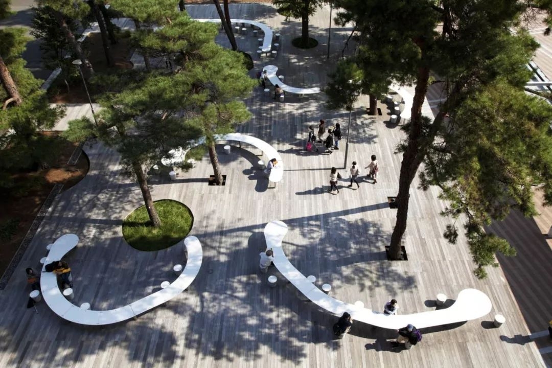 它们有不同长短,不同弯曲度,看似随机地设置在休闲广场。高大的植物林立,形成环境优美的树荫,让在这里休憩或学习的人们倍感舒适。