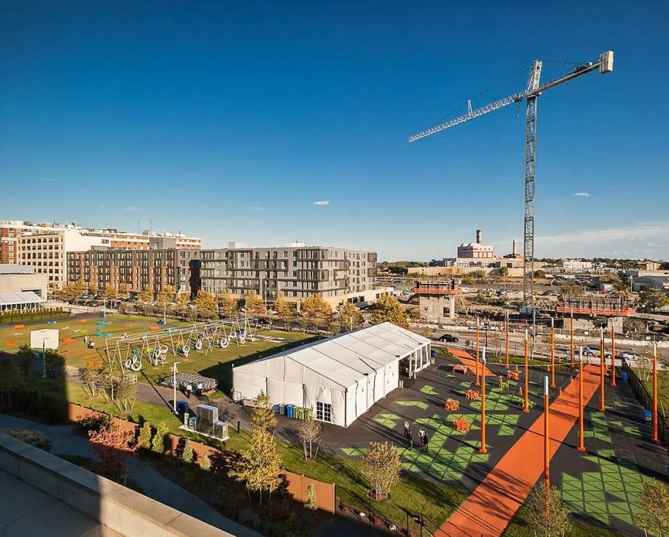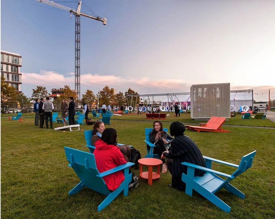 D大道街区位于南波士顿、创新区与自由码头、Fort Point运河以及Channel Center社区几大重要区域的中心交汇点。管理部门希望在此建立一个充满了互动性、灵活性、高技术含量,充斥着艺术与活动氛围的新式街区,而无论当地居民、劳动者、与会人员或是游客都能在其中找到自己心仪的场所,即诞生了临时性草地广场The Lawn on D。
