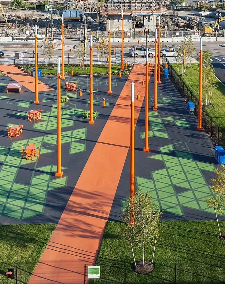 充满活力的定制图形标识和迷人的灯光照亮了原本阴暗的环境,使场地变得大受欢迎。这种喜庆、欢乐和明亮的色调吸引了无数路人的目光,与现有公园的单一色调形成鲜明对比,成为了蒙特利尔市中心真正丰富多彩、充满生机的绿洲,激发人们的好奇和探索心理。