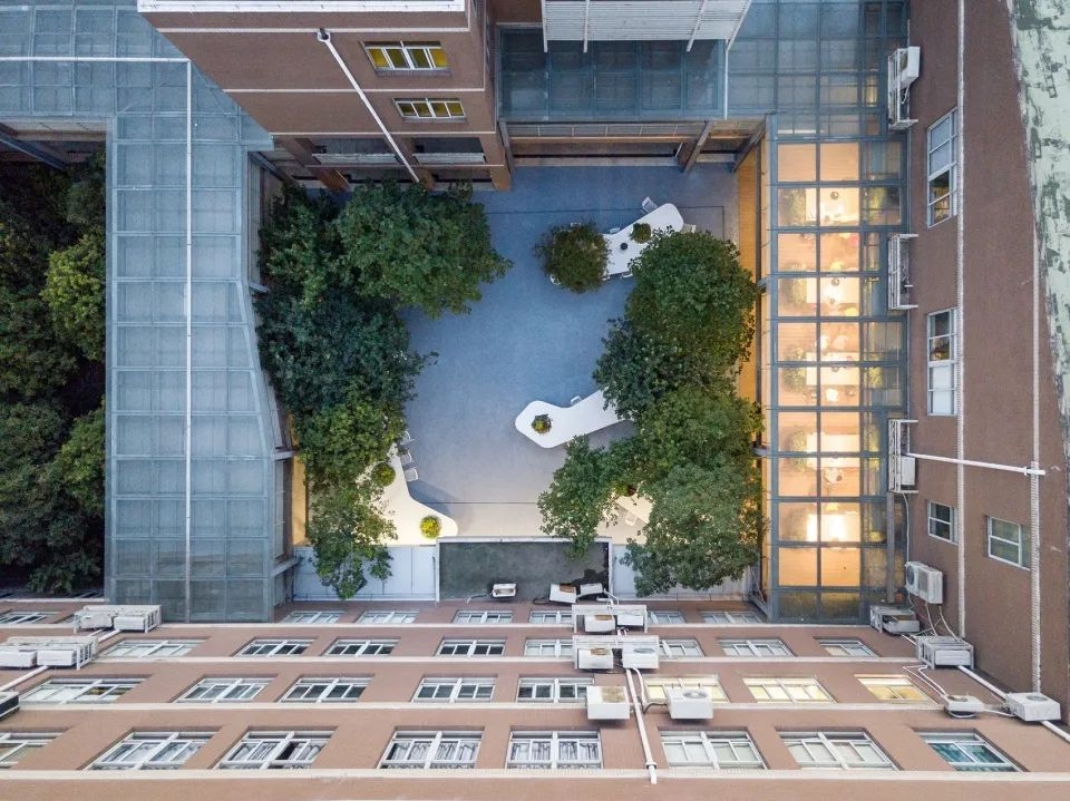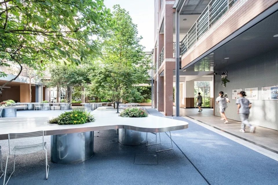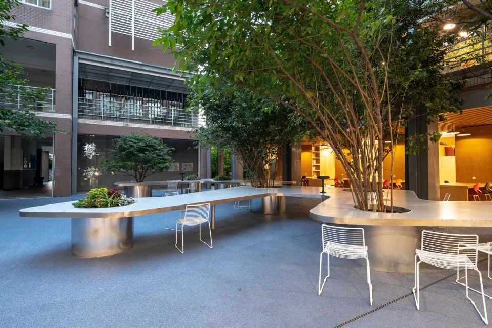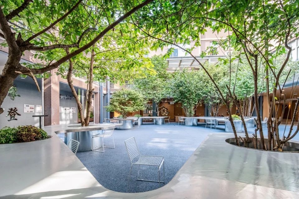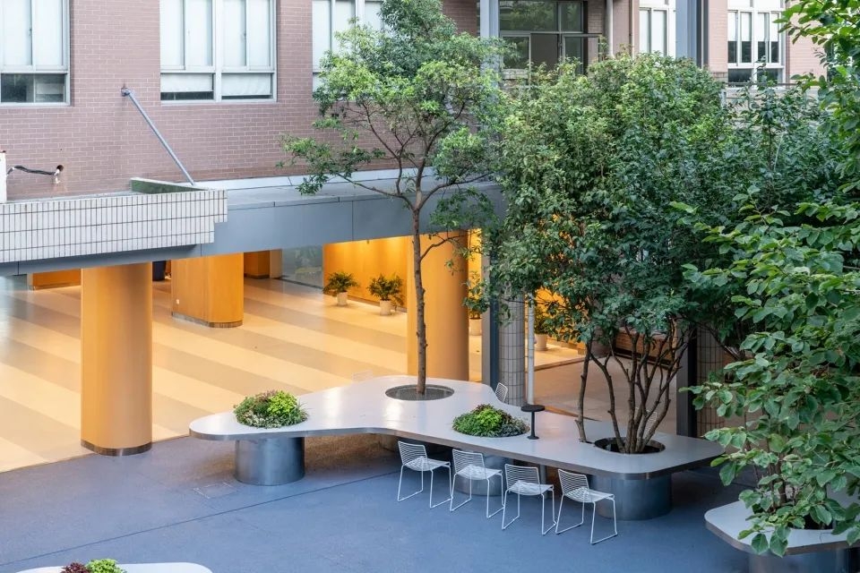 新的庭院以树木和桌子为主要元素,被称为树桌花园。保留下的11棵树木都是非常普通的品种,一点都不名贵。但是经过多年的生长,已经形成了绿意盎然的上层覆盖,延续这个元素,也是在延续校园的记忆,同时也是对绿色的尊重。