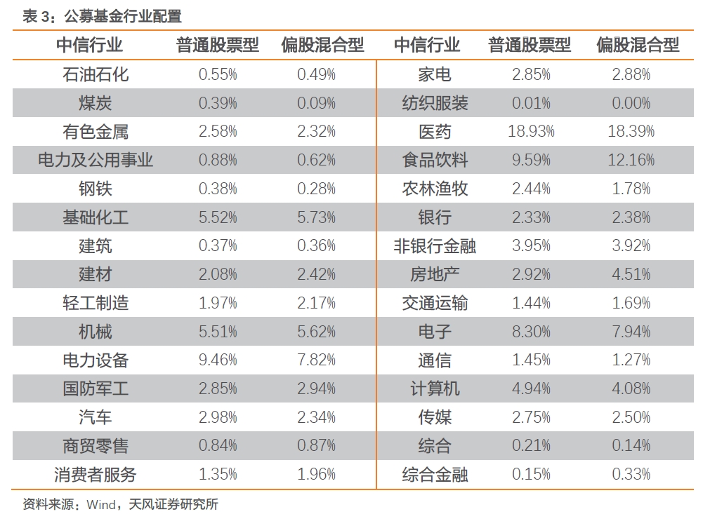 以Wind基金分类为基础,我们分析了普通股票型基金与偏股混合型基金两类公募基金的平均配置情况。