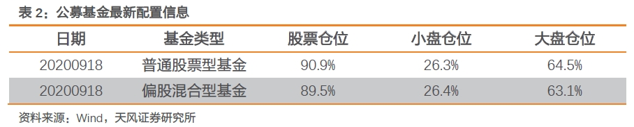 截止2020-09-18日,普通股票型基金仓位中位数为90.9%,相比上周估计值下降0.2%,偏股混合型基金仓位中位数为89.5%,相比上周估计值下降0.6%。上周普通股票型基金与偏股混合型基金在市场大盘组合估计仓位值分别上升3.2%和上升1.0%,在市场小盘组合估计仓位值分别下降3.4%和下降1.6%。普通股票型基金和偏股混合型基金当前仓位估计值在2016年以来仓位估计值序列中的分位点分别为80.5%和92.5%。