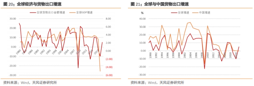 如果疫苗进展顺利、疫情在明年得到迅速控制,根据IMF、世界银行、OECD等国际机构预测,全球经济预计将有接近5%的正增长。相应的,货物贸易预计也将出现不小的反弹。从历史来看,全球货物出口增速和中国货物出口增速一致性较高,而且中国往往会高于全球增速。