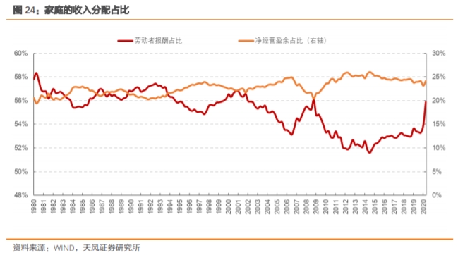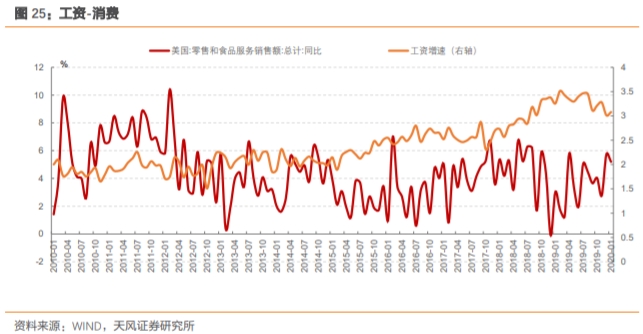 家庭部门收入分配占比下降,消费的内生动能下降。美国经济的关键是消费,而消费的动能是家庭部门的收入,2008年金融危机后的复苏周期内,家庭部门的收入分配占比是持续下降的,也导致这一轮的复苏偏弱。疫情前,从工资-消费的逻辑看,美国消费也已经显示出拐点。