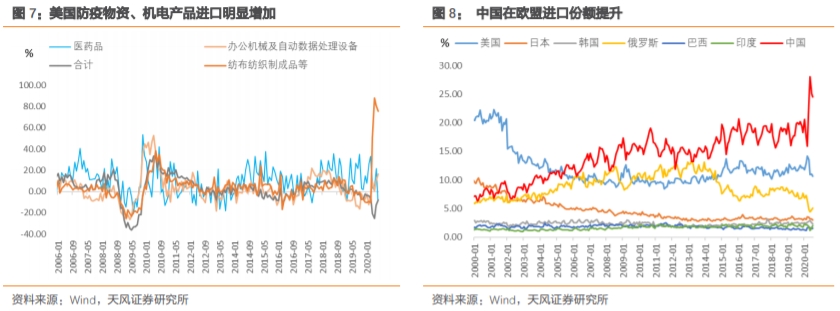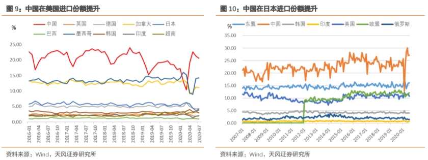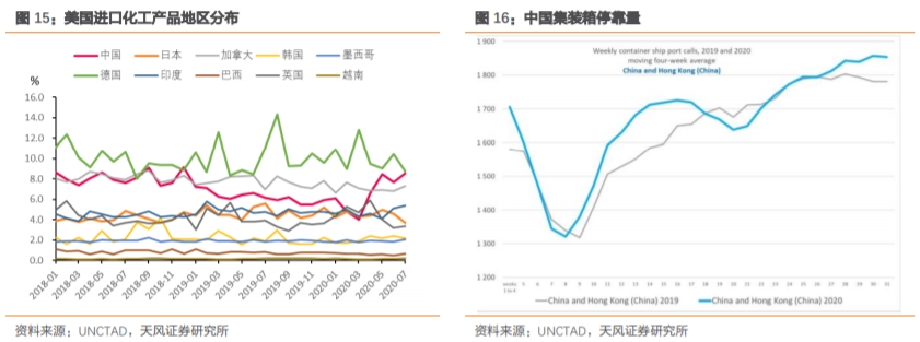 既有需求结构的变化,又有份额替代效应。疫情之下海外防疫物资、“宅经济”相关的进口需求大幅增长,这恰好是中国优势较大的产品。由于疫情错位和产业链优势,中国的出口份额也在提升,不仅体现在防疫物资、“宅经济”,也体现在化工、钢材、家具等其他产品,对发达国家、发展中国家都有一定的替代。此外,我们从前面的集装箱停靠量亦可以看出,中国、东南亚外贸恢复最好,而其他地区依然远低于去年同期水平。