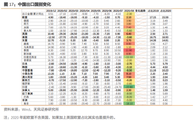 总而言之,如果不考虑今年疫情的影响,美日经济周期本身也开始下行,另外英国脱欧以及欧盟内部的财政约束问题也在一定程度上欧洲的复苏进程。这就决定了明年全球需求(特别是发达经济体需求)的复苏并非强复苏,而只是弱复苏。在此影响之下,明年我国出口虽然会有所回暖,但改善幅度可能相对有限。