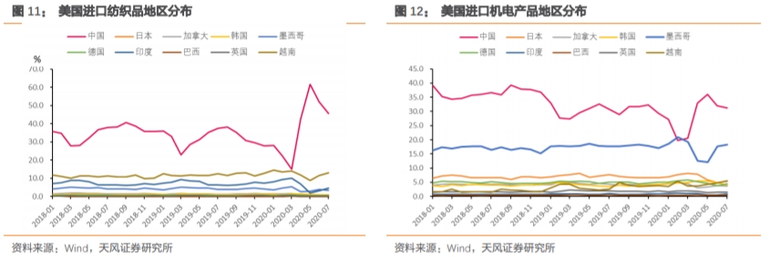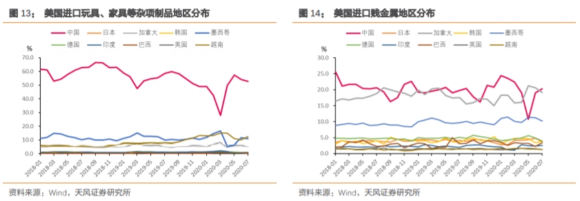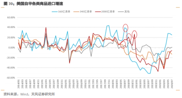 虽然中美贸易摩擦不断,但疫情加重了美国对中国商品的依赖。我们更新了美国自华进口商品中各批关税清单的进口增速,可以发现各类商品进口增速都有明显恢复。如果疫情解除,海外供给恢复,叠加各国对产业链安全的担忧,出口可能还会继续面临压力。