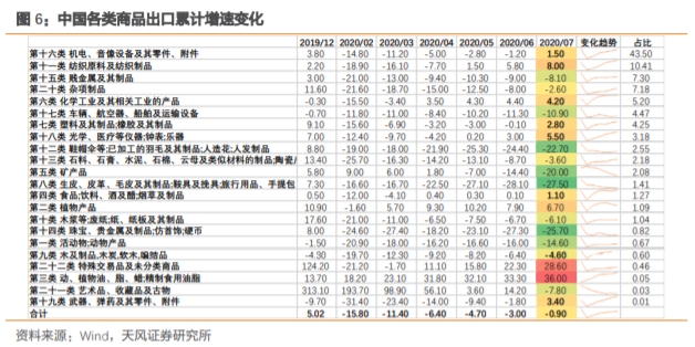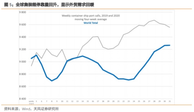 根据联合国的跟踪数据,6月下旬开始全球集装箱停靠量明显回升,显示全球外贸需求也已出现回暖。