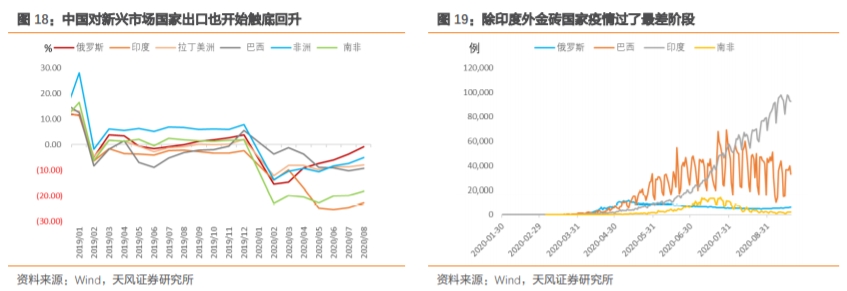 疫苗正式推出至少要等到今年年底,短期内全球疫情还没有得到完全控制,外需的结构变化(防疫物资、“宅经济”、份额替代)难以显著改变,因而年内出口大概率还有韧性。我们也可以看到,中国对新兴市场出口(包括印度)也呈现触底回升态势。