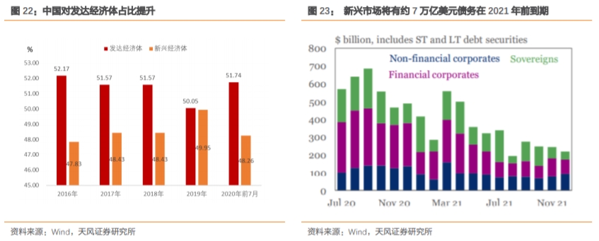 实际上疫情之后发达国家在中国出口目的地占比不降反升。美欧日国家经济实力更强、刺激力度更大而且拥有储备货币地位,因而能够支撑一定的进口需求。而新兴市场国家一度面临大规模资本外流、货币贬值压力,高额债务对政策空间和经济前景都构成了制约。