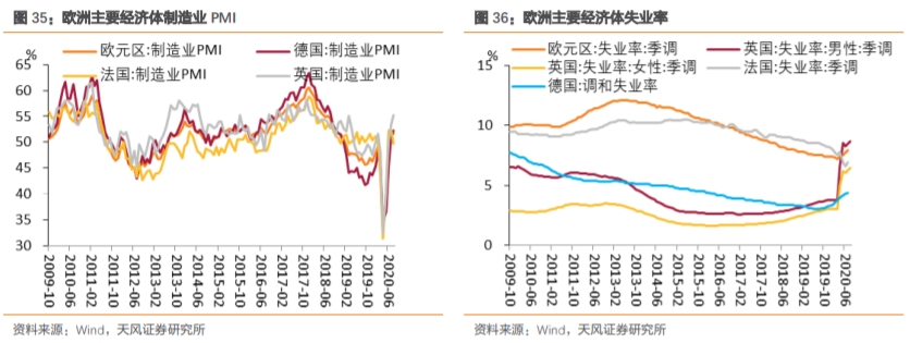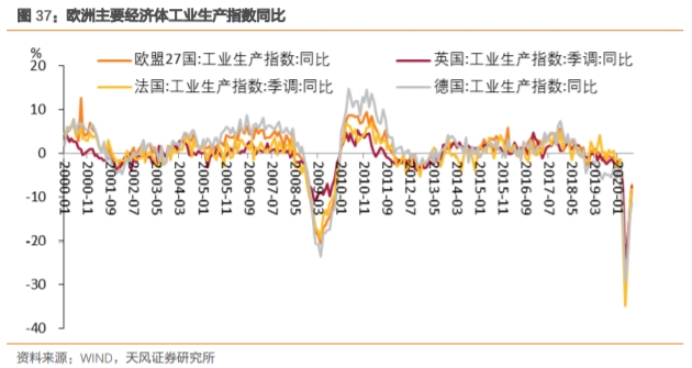 疫情之前,虽然欧洲主要经济体制造业PMI有所反弹,失业率也在整体回落,但内部结构仍有分化,其中法国和意大利制造业活动改善态势并不明显。此外,欧洲主要经济体工业生产指数同比仍在继续下行。