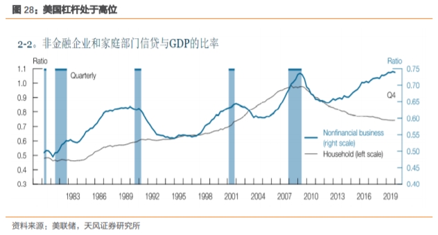 企业部门处于高债务状态,具有去杠杆压力。在疫情发生之前,美国企业部门杠杆持续上升。