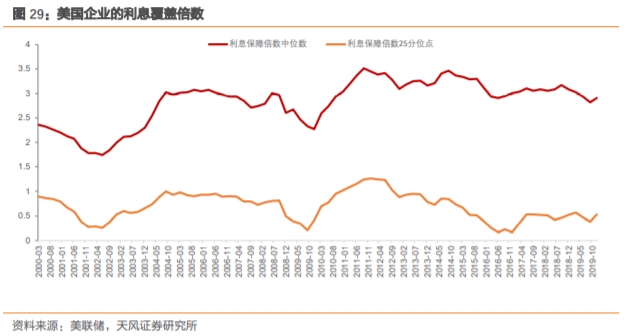 从偿债压力上看,截至2019年12月,美国企业的利息保障倍数的中位数为2.91,25分位点的利息保障倍数是0.53,也就是说疫情前至少有25%的企业利润支出无法覆盖利息支出。