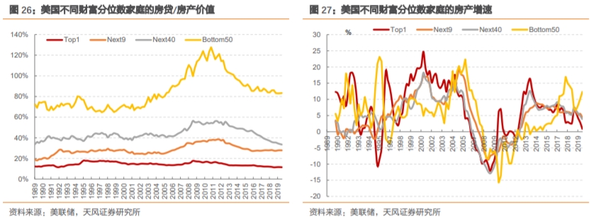 家庭部门持续去杠杆,但杠杆水平存在分化。美国家庭部门总体杠杆水平较低,但是按照财富分位数划分,杠杆水平有明显分化,前1%家庭房贷/房产价值为11%,后50%家庭这一比例则为83%,2008年后加杠杆的家庭其实主要是后50%部分家庭,而这一部分家庭受疫情影响最为严重。