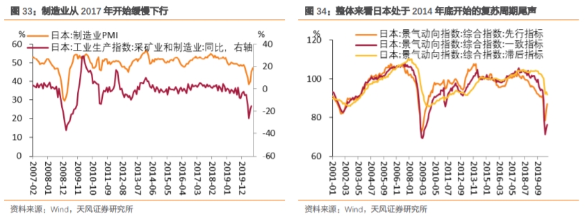 另外,疫情之前日本制造业从2017年开始缓慢下行,企业景气程度仍在高位但出现拐点,整体来看日本处于2014年底开始的复苏周期尾声。