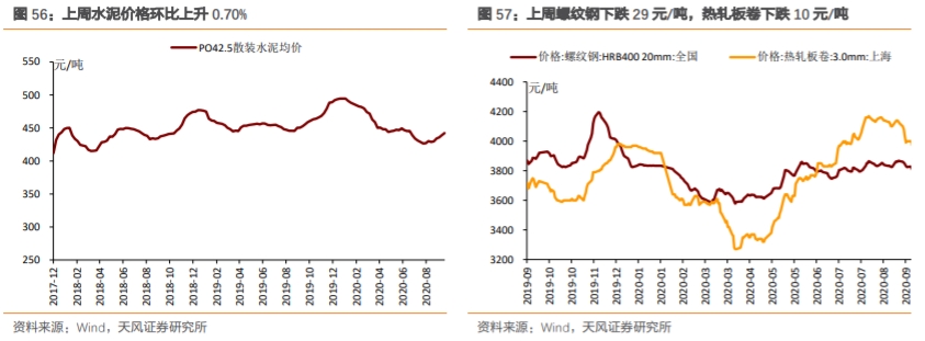 水泥:全国普通42.5级散装水泥均价为442.37元/吨,环比上升0.70%。