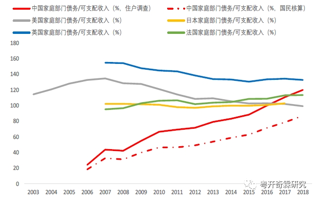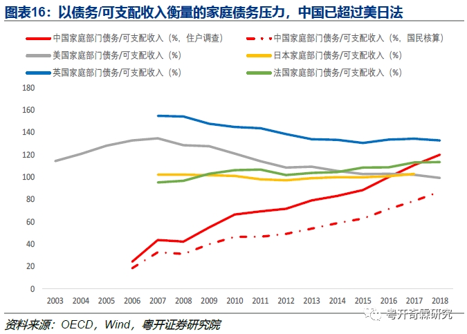 最后来看债务压力。衡量居民部门的偿债负担,通常喜欢用居民杠杆率,即居民债务余额/GDP,但这个指标没有充分考虑到GDP在各个国家内部不同主体之间的分配,用债务余额/可支配收入更为客观。中国以城乡一体化住户调查口径的居民可支配收入,测算的这一偿债指标,已高于美国、日本和法国。