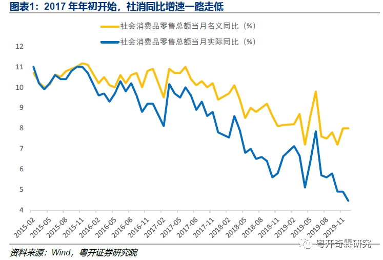 实物性商品消费方面,可以看到2017年年初开始,社会消费品零售总额名义增速就一路走低,剔除价格因素后,实际增速下滑得更快。