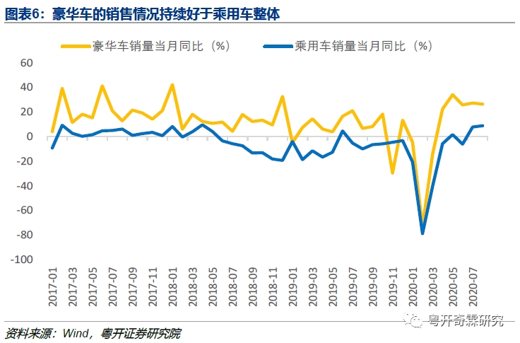 一是看大件可选消费——汽车。2018年二季度至今,多数月份的汽车销量同比是负增长的,市场各方对此也进行了很多讨论。但是我们看到,相同时期以BBA,即奔驰、宝马和奥迪衡量的豪华车销量同比增速,大部分时间都在两位数,销售情况要比汽车行业整体好得多。
