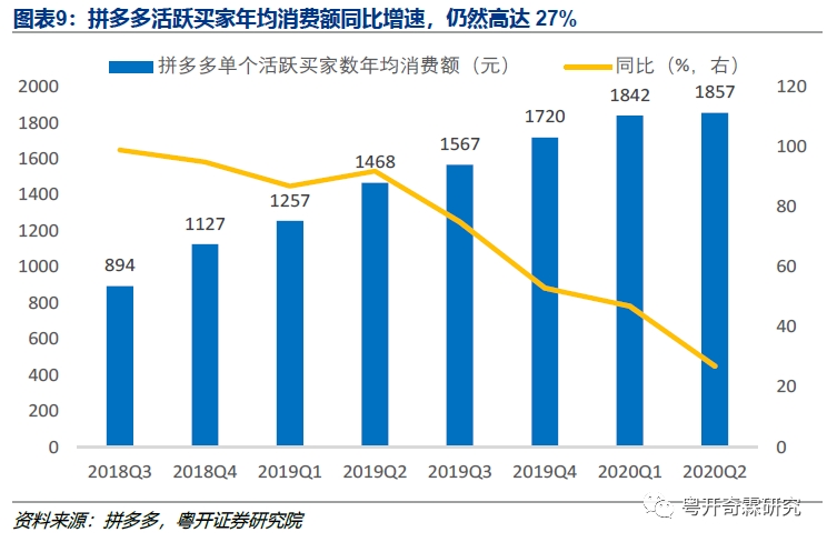根据拼多多的财报,2020年二季度时,单个活跃买家的年均消费额为1857元,同比增长27%。这个增速远高于社会消费品零售总额的同比增速,以及实物商品网上零售额的同比增速,一部分消费开始被在拼多多上的网购所替代。
