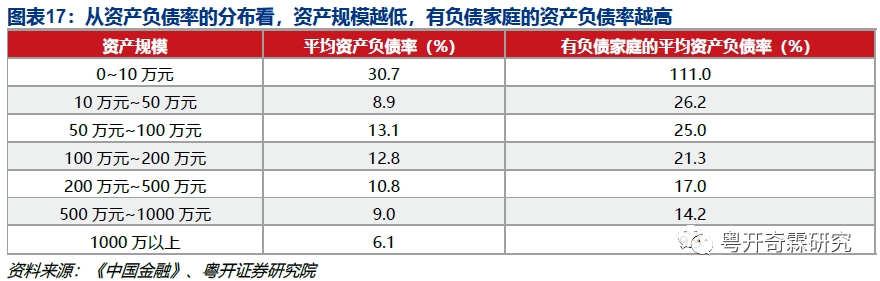 从结构的视角来看居民债务,可以发现资产越少的人,债务压力越大。上文提到的中国人民银行城镇居民家庭资产负债调查结果显示,资产规模越低,有负债家庭的资产负债率越高。