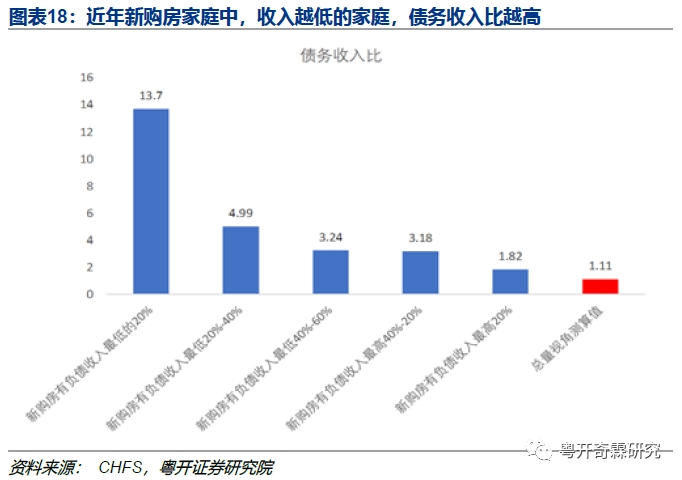 房贷是中国家庭的主要债务来源,西南财经大学中国家庭金融调查与研究中心的调查显示,2015-2017年新购房有负债的家庭中,收入越低的家庭,债务收入比越高。收入最低的20%家庭债务收入比为13.7,收入最高的20%家庭债务收入比也有1.8,都要比城乡调查口径下的2017年债务收入比1.1更高。