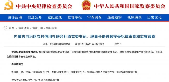 9月25日,中央纪委国家监委网站公告显示,内蒙古自治区农村信用社联合社原党委书记、理事长佟铁顺涉嫌严重违纪违法,目前正在接受纪律审查和监察调查。