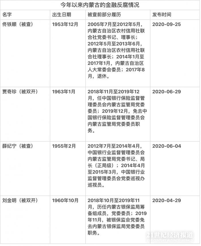 21世纪经济报道记者发现,上述被查的佟铁顺为内蒙古金融圈年内第四例。此前,内蒙古银保监局原党委委员贾奇珍、刘金明已被双开;原内蒙古银监局局长薛纪宁正在接受纪律审查和监察调查。