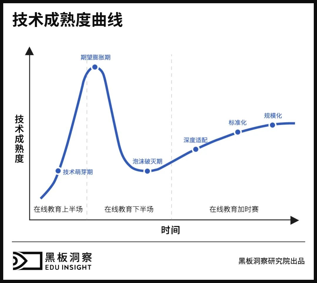 突如其来的疫情开启在线教育下半场进程,推升了在线教育渗透率,环境因素迫使线下教培机构向线上发展。在线教育发展进程与技术成熟度曲线大抵相同。2020年线上教育机构数量已突破23万。有学习需求的学生和家长无论意愿如何都被迫接受了近半年的在线教育。这是机遇也是挑战,是拓客的红利期同样也是行业重新洗牌的风口,在线教育进入了期望膨胀期。疫情下,互联网数字化进程加速,但在线教育经营业绩两极分化,头部企业仍占据绝大部分市场份额,尤其当红利退去,部分在线教育机构进入泡沫破灭期。