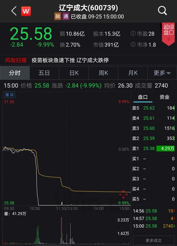 猝不及防,400亿市值的疫苗大牛股辽宁成大早盘闪崩跌停。