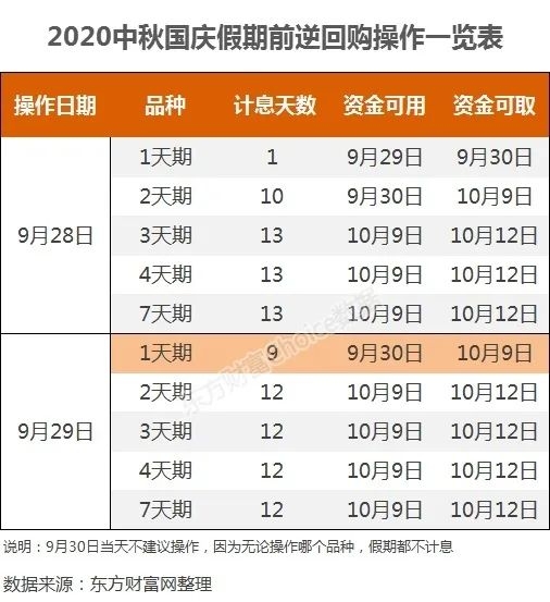 特别强调的是,9月30日这一天不建议操作逆回购,因为这一天不管操作什么品种,中秋国庆长假都是不计息的。