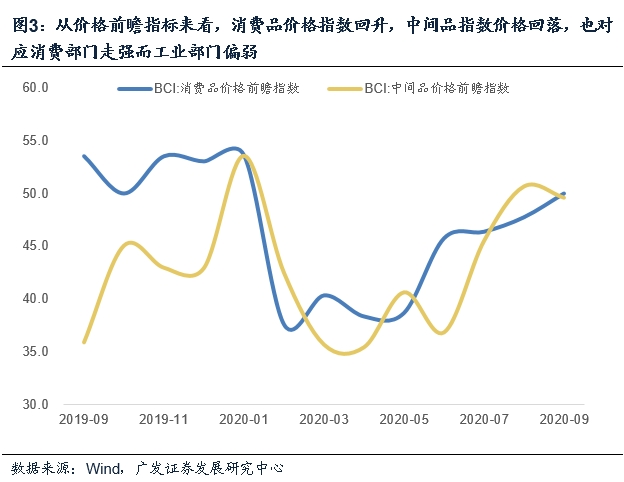 BCI价格分项也证实这一点,9月消费品价格指数上升2.2个点,中间品价格指数回落1.1个点,也对应消费部门偏强,而工业部门偏弱的特征。