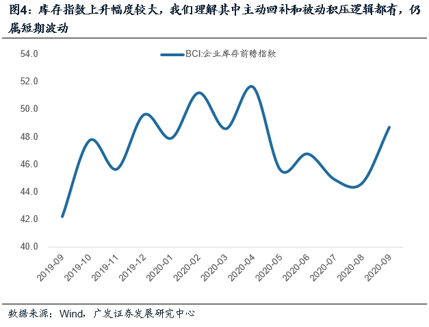 库存指数上升幅度较大,我们理解其中主动回补和被动积压逻辑都有,仍属短期波动,目前尚未进入典型库存回补阶段。