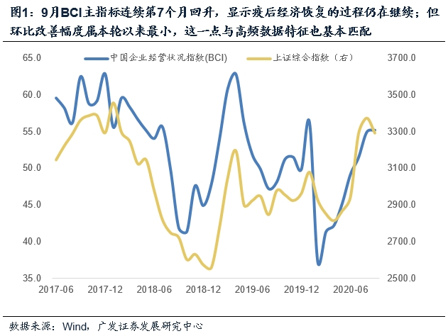 第一,9月BCI主指标连续第7个月回升,显示疫后经济恢复的过程仍在继续;但环比改善幅度不大,这一点与高频数据特征也基本匹配。