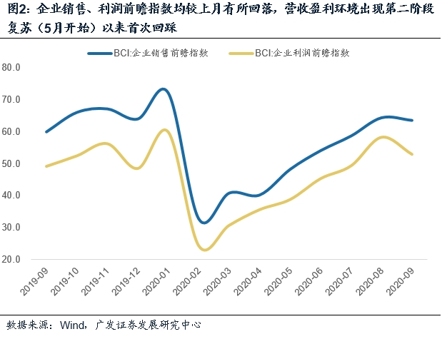 9月BCI主指标连续第7个月回升,显示疫后经济恢复的过程仍在继续;但环比改善幅度不大,这一点与高频数据特征也基本匹配。9月BCI数据为55.2,属这一指标自2月触底以来连续第7个月回升。这意味着疫后经济恢复的大逻辑仍没有破坏。
