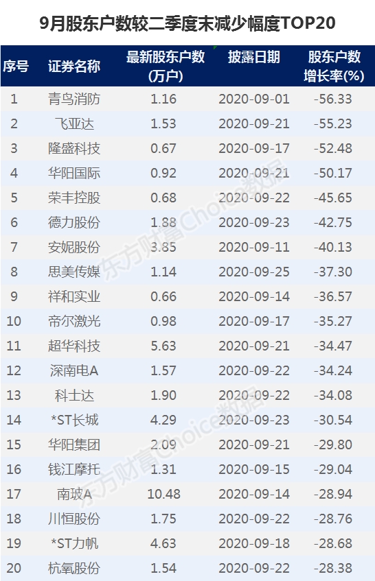 其中青鸟消费较二季度末股户数减少了56%,飞亚达、隆盛科技、华阳国际、荣丰控股、德力股份、安妮股份较二季度末股东户数减少超40%。