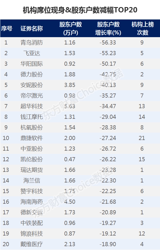 比如青鸟消防、飞亚达等在三季度股东户数持续下降过程中,机构席位上榜次数分别为9次和5次。