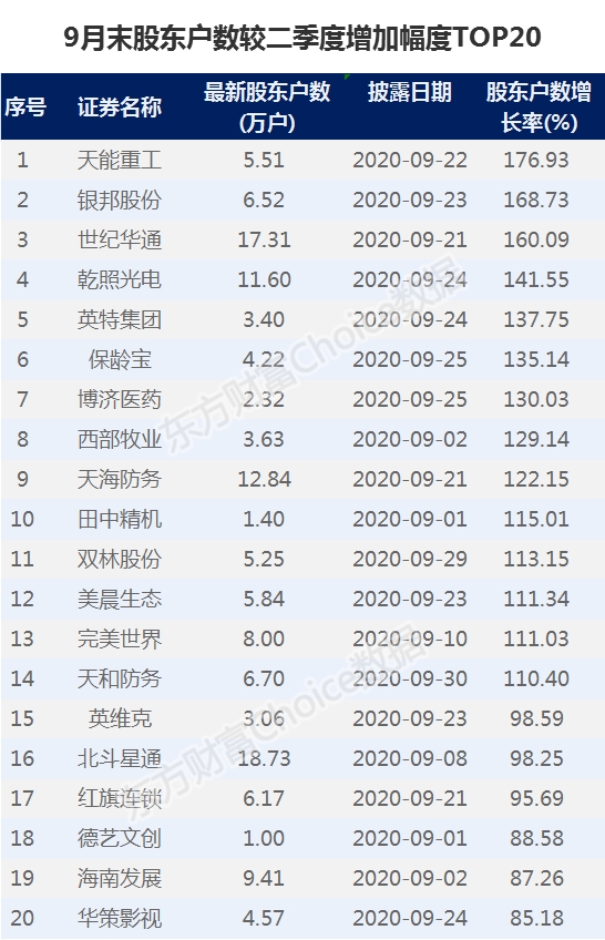 其中天能重工、银邦股份、世纪华通、乾照光电、英特集团等14股股东户数增幅超100%!
