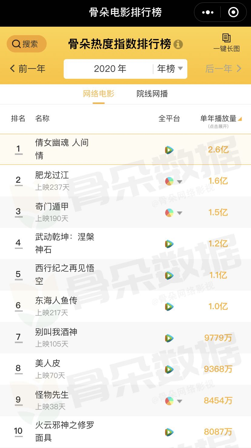 截至撰稿,骨朵网络电影年度排行榜上,累计单年播放量前十名的大多数作品类型相近,仍旧以玄幻、传奇等题材为主。与此同时,在这些头部网络电影作品背后,大多仍旧是已经“做大”的网络电影制作公司。而网络电影核心受众的喜好和需求,也在一定程度上限制了网络电影艺术性的提升发展。