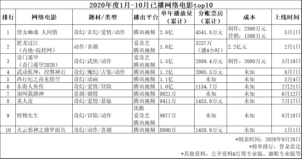 (截止到10月前,本年度网络电影top10中,“奇幻”类型网络电影占8部)