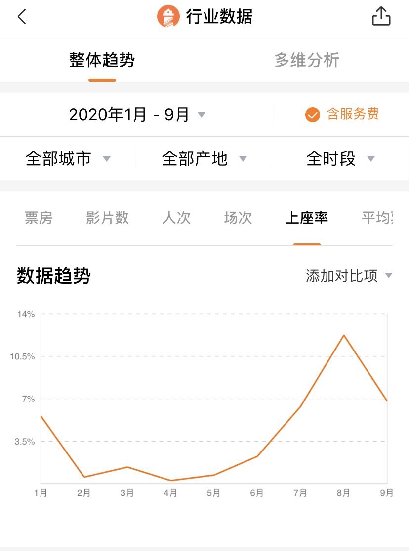 灯塔数据显示,疫情期间至今院线上座率的数据趋势变化明显。院线电影上座率在疫情过后的8月迎来了显著变化,这一波小高峰甚至被行业内评为“报复性”观影,随后才是上座率回归冷静的趋势表现。